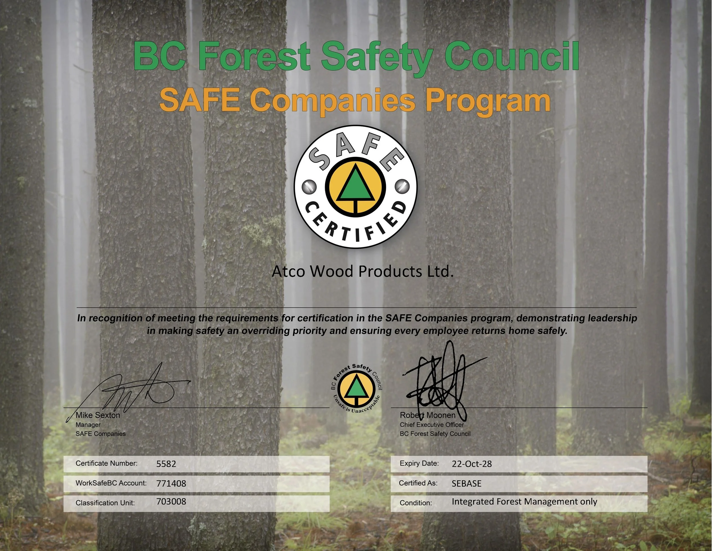 The BC Forest Safety Council has repeatedly acknowledged us, “in recognition for meeting the requirements for certification in the SAFE Companies program, demonstrating leadership in making safety an overriding priority and ensuring every employee returns home safely.”